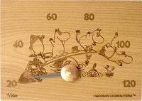 Superbe thermomètre de sauna sur le thème des Moumines, fabriqué en bois de bouleau massif finlandais thermotraité. Le cadran met en scène toute la famille Moumine profitant d’une baignade ensemble.